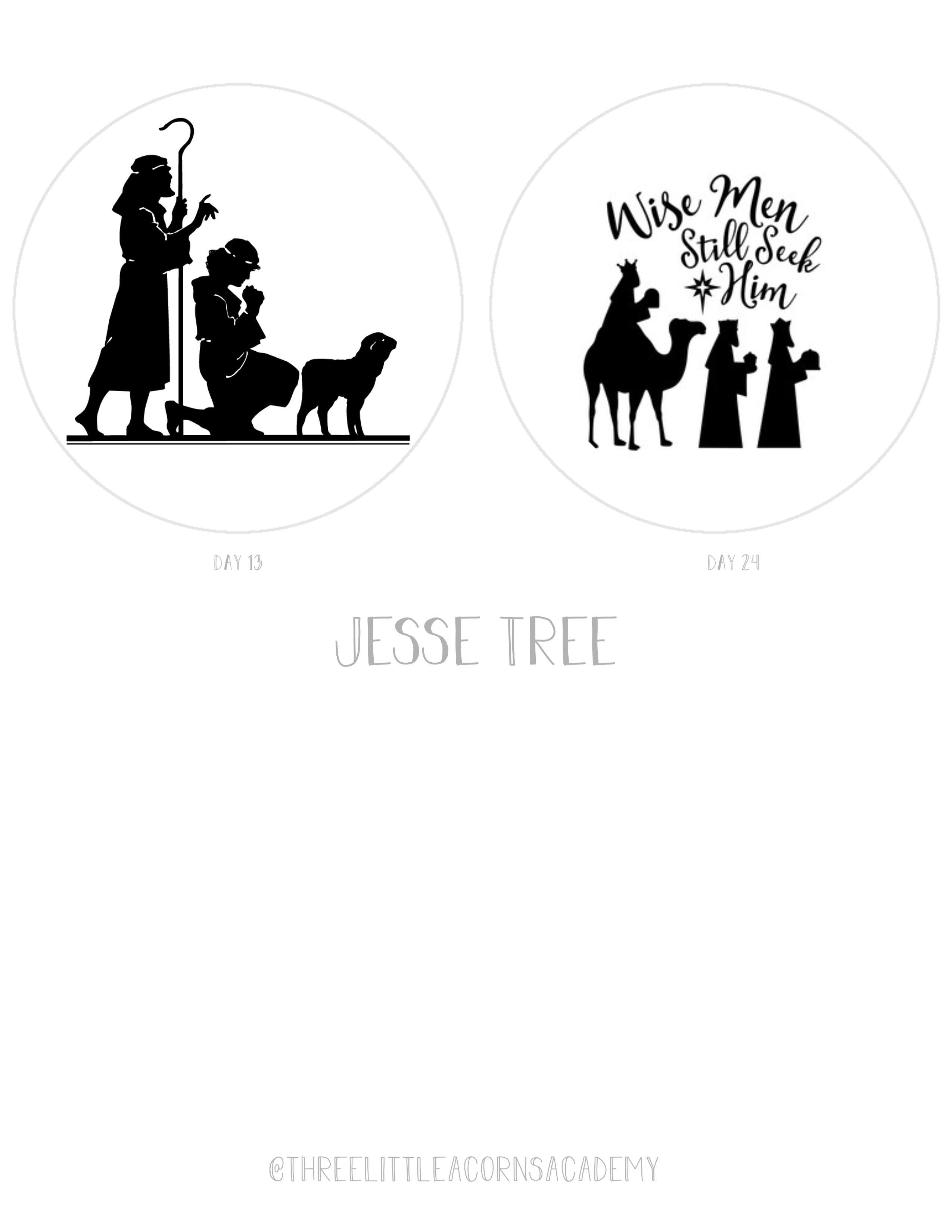 “The Jesse Tree is a way of telling the story of God’s plan from the beginning of time to redeem His people by sending a Savior. It follows the lineage of Christ’s family and key people in the Old Testament that God uses to tell His story from Creation through Christ’s birth. It is a countdown daily to Christmas with the telling of a story, and an ornament that acts as a symbol and visual reminder of the story.”